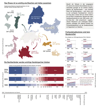 Von unmittelbar noch grösserer Bedeutung sind geordnete, rechtssichere Handelsbeziehungen mit dem wichtigsten Handelspartner, der EU. Im Jahr 2015 gingen knapp 54% aller Schweizer Warenexporte in die EU, 73% aller Importe stammten von dort. Allein das Land Baden-Württemberg ist wertmässig der wichtigere Handelspartner als China. Geografische und kulturelle Nähe sind bedeutend – und werden es bleiben. Das gilt nicht zuletzt im Kontext der immer wichtiger werdenden internationalen Wertschöpfungsnetzwerke, in denen sich die Unternehmen strategisch positionieren. Für die globale Netzwerkfähigkeit von Unternehmen ist die unbürokratische Verschiebung von Vorprodukten über Landesgrenzen hinweg eine zentrale Voraussetzung.