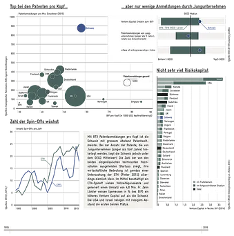Bei den internationalen Innovationsrankings (WEF, IMD, Global Innovation Index) belegt die Schweiz durchgehend die Spitzenposition. Wir können uns über umfangreiches geistiges Eigentum, gute Universitäten und das hohe Niveau der F&E-Ausgaben (sowohl staatlich als auch privat) freuen. Nicht allzu gut reflektieren diese Indikatoren aber das Marktpotenzial der Innovationen. Die Transformation der technologischen Innovation in einen konkreten wirtschaftlichen Mehrwert verläuft in der Schweiz alles andere als optimal. Das Land bringt nicht viele junge innovative Unternehmen hervor und nur selten erreichen diese eine wirtschaftlich relevante Grösse. So liegt die Anzahl Patentanmeldungen, die von Jungunternehmen (jünger als fünf Jahre) eingereicht werden, unter dem OECD-Mittel – dies, obwohl die Schweiz Patentweltmeister ist. Die Patente werden hier aber meist von den etablierten multinationalen Unternehmen hinterlegt, was deren Wichtigkeit für die Schweizer Wirtschaft unterstreicht. Allerdings erfolgen viele dieser Patentanmeldungen präventiv zu defensiven Zwecken und sind daher nicht unbedingt ein Zeichen hoher Innovationstätigkeit.