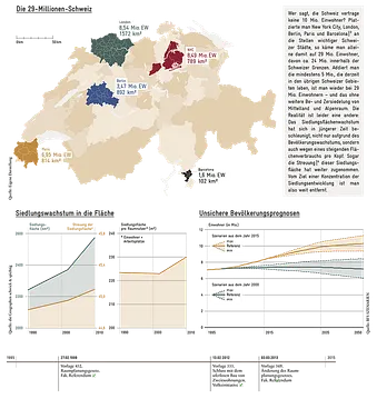 Wer angesichts solcher Zahlen die unweigerliche Verbauung letzter Grünräume im Mittelland und die Gefährdung der alpinen Freiräume befürchtet, dem helfe folgendes Gedankenspiel: Setzt man New York an die Stelle von Zürich, London an die Stelle von Basel, Berlin an die Stelle von Bern, Paris an die Stelle von Genf und Barcelona an die Stelle von Lugano, würde die Schweiz alleine mit diesen attraktiven Metropolen der westlichen Welt auf 24 Mio. Einwohner kommen. In den restlichen Gebieten hätte es damit enorm viel Platz für die Pflege traditioneller, von «Dichtestress» verschonter Lebensstile, für reichlich Agrarland, für Naherholungsgebiete und für dünn besiedelte Berglandschaften.