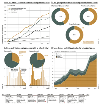 Immer häufiger ist die Verkehrsinfrastruktur an den neuralgischen Stellen während der Stosszeiten überlastet. Die Reaktion darauf ist in der Schweiz traditionell der Kapazitätsausbau. Deshalb und aufgrund der engmaschigen Bahn- und Buserschliessung selbst von Gebieten mit niedrigem Verkehrsaufkommen hat die Schweiz ein im internationalen Vergleich extrem teures Verkehrssystem. Die Pro-Kopf-Investitionen in die Schieneninfrastruktur sind siebenmal so hoch wie in Deutschland.