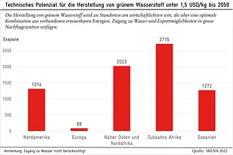 Staaten wie Deutschland oder Japan sind hingegen auf Importe angewiesen. Entsprechend betreiben diese Länder eine aktive Wasserstoffdiplomatie, da ihre industriellen Ballungsräume entsprechend versorgt werden müssen. Dazu gesellt sich eine dritte Gruppe von Staaten wie China oder die USA, die ihren Bedarf mehr oder weniger selbst decken werden.