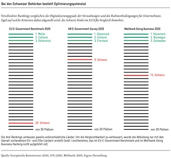 Natürlich sind solche Rankings mit Vorsicht zu geniessen. Die methodischen Probleme internationaler Vergleiche sind hinlänglich bekannt. Doch das Bild spiegelt sich auch in nationalen Umfragen. So kann etwa der «Nationalen E-Government-Studie 2019» entnommen werden: «Die Mehrheit der befragten Unternehmen, die eine Dienstleistung bisher nicht elektronisch abgewickelt haben, wünscht sich die Möglichkeit einer elektronischen Abwicklung bei fast allen Dienstleistungen.»