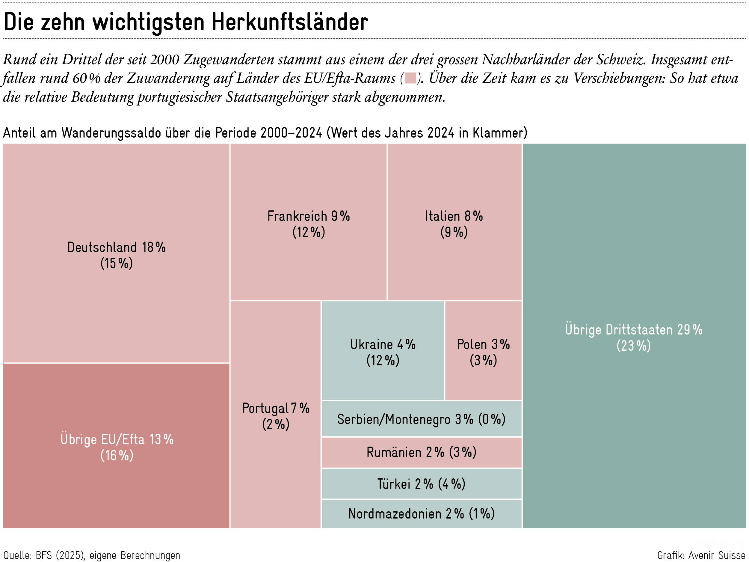 Seit der Jahrtausendwende belief sich die Nettozuwanderung von Ausländern auf durchschnittlich 68’000 Personen pro Jahr. Kumuliert entspricht dies bis Ende 2024 insgesamt rund 1,7 Millionen Personen. Drei Fünftel (60%) der Nettozuwanderung betreffen Personen aus dem EU/Efta-Raum. Betrachtet man nur den Zeitraum seit 2007 – dem Jahr, in dem die volle Personenfreizügigkeit mit der EU in Kraft trat –, so betrug der jährliche Wanderungssaldo durchschnittlich 77’000 Personen, davon 64% aus dem EU/Efta-Raum.