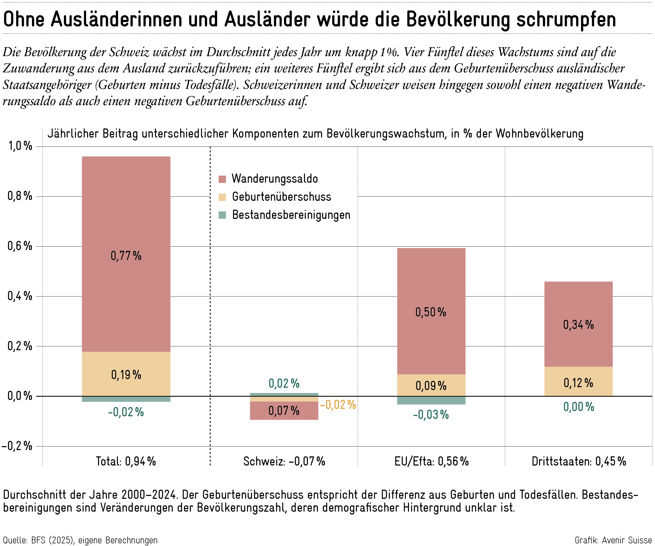 Schweizerinnen und Schweizer weisen einen negativen Wanderungssaldo auf: Jedes Jahr wandern mehr Schweizer aus als zurückkehren. Zudem sterben inzwischen mehr Personen mit Schweizer Pass als geboren werden. Das gesamte Bevölkerungswachstum entfällt somit auf die ausländische Bevölkerung. Dass die Zahl der Schweizerinnen und Schweizer dennoch über die Jahre leicht steigt, liegt einzig an Einbürgerungen.