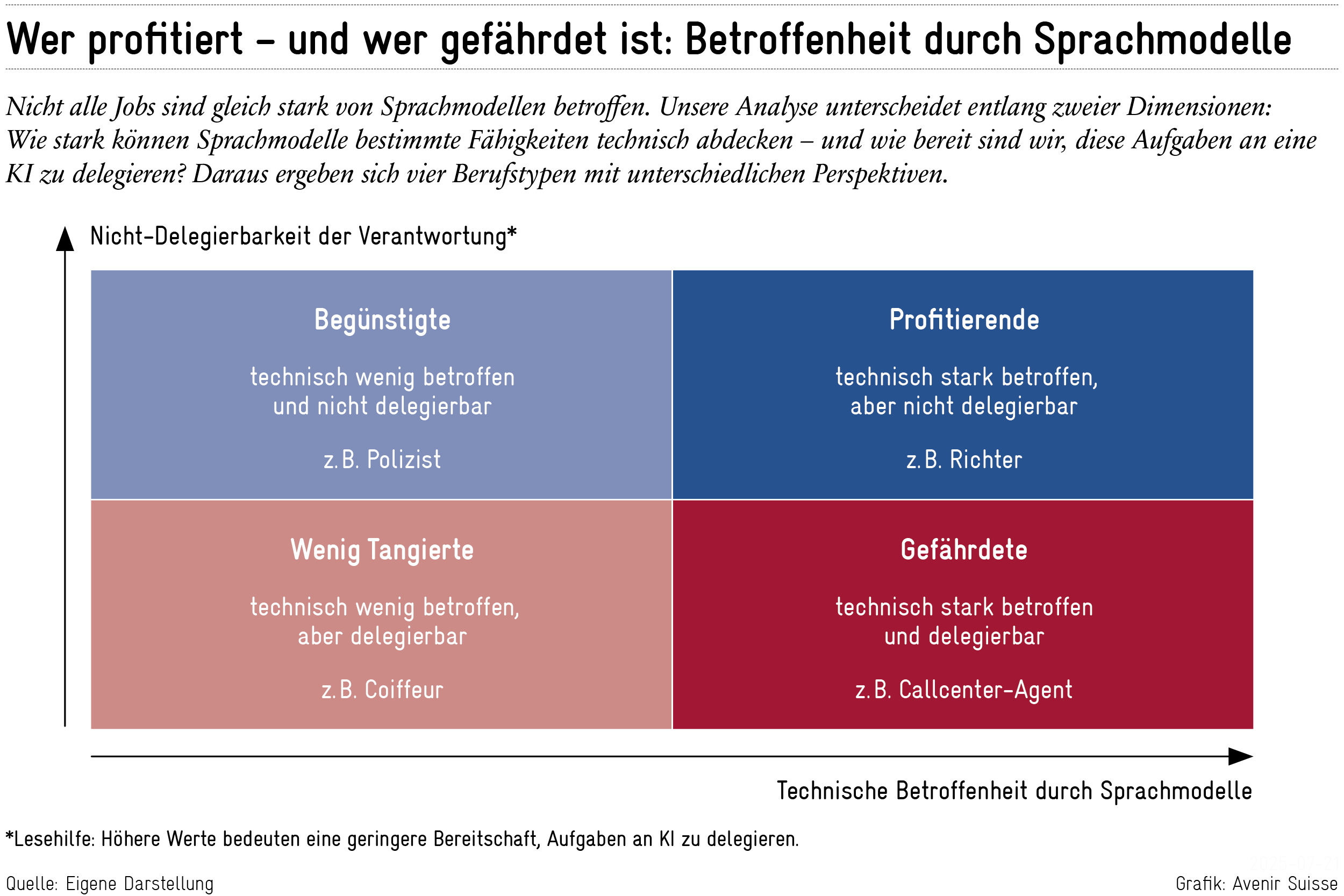 Erst die Kombination aus technischer Ersetzbarkeit und Bereitschaft zur Delegation entscheidet, ob ein Beruf gefährdet ist, oder ob er von Sprachmodellen profitiert. Daraus ergeben sich vier Kategorien (siehe Abbildung):
