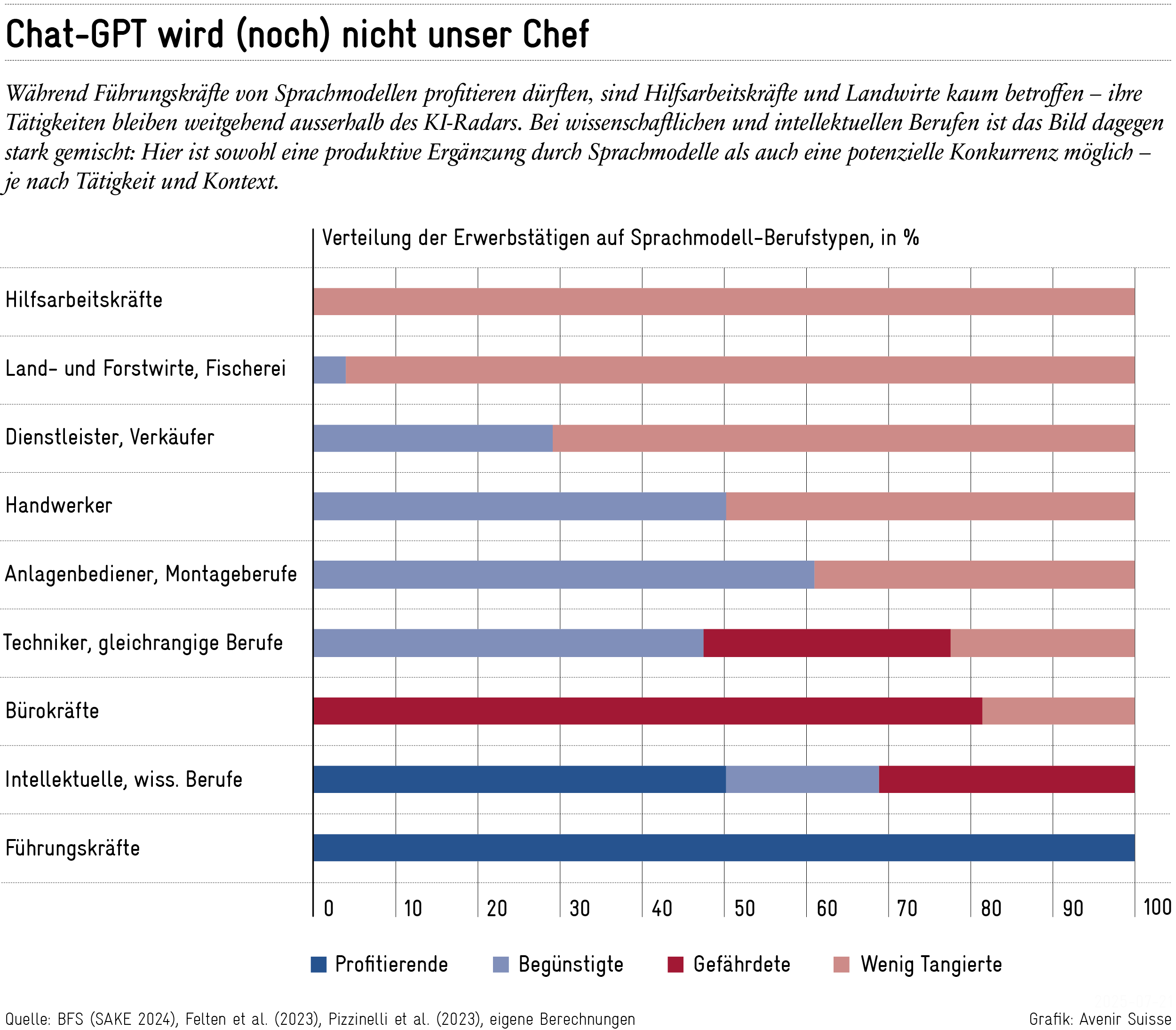 - Profitierende (23%): Führungskräfte, Lehrpersonen, Naturwissenschafter, Juristinnen und Ingenieure. Sie nutzen Sprachmodelle zur Effizienzsteigerung, doch ihre fachliche Expertise und Entscheidungsrolle bleiben unersetzlich.