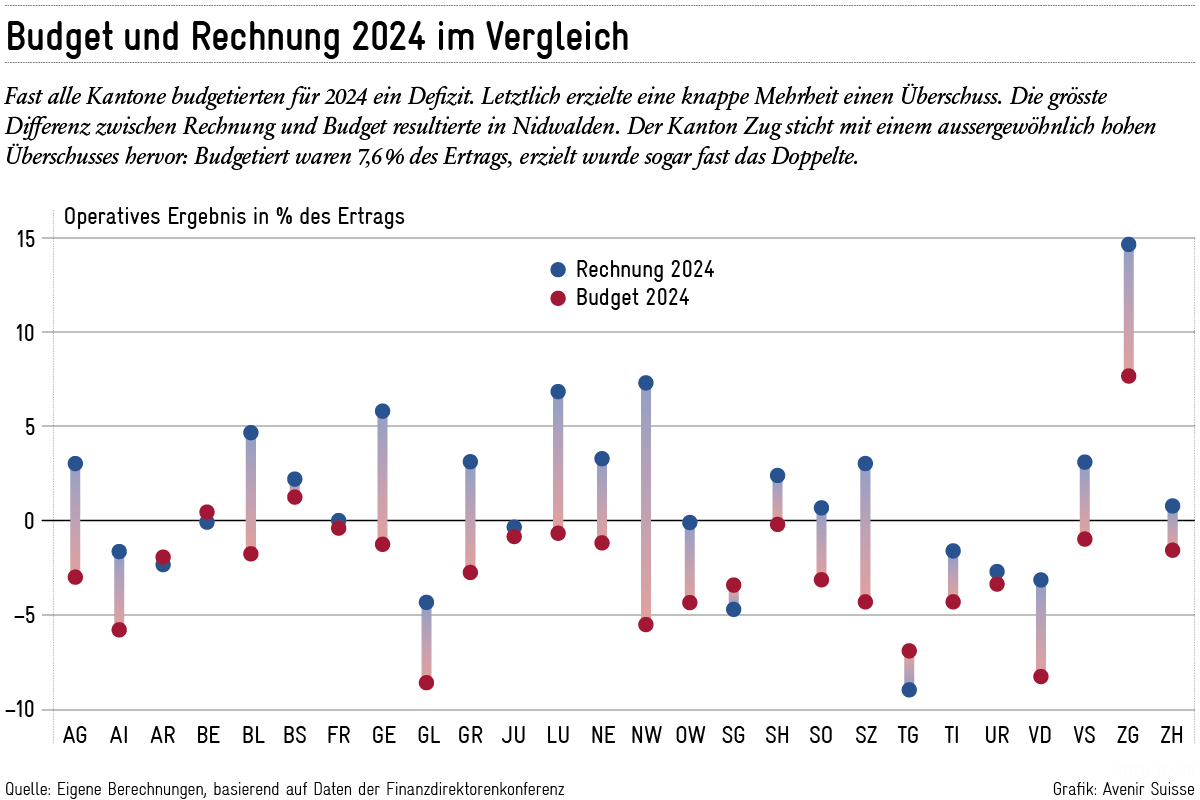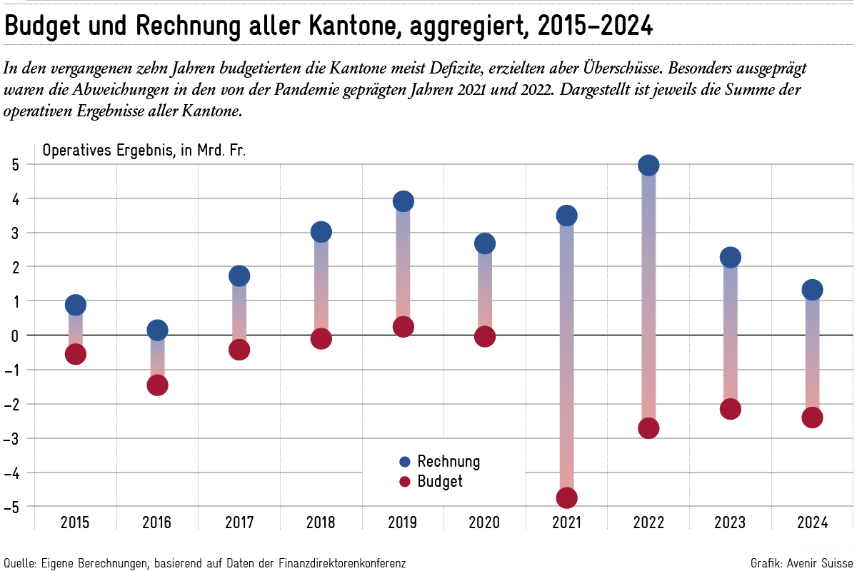 2024 war ein aggregiertes Defizit von sogar 2,41 Mrd. Franken budgetiert. Tatsächlich resultierte ein Überschuss von 1,34 Mrd. Franken – eine Differenz von 3,75 Mrd. Franken. Nur 3 Kantone hatten einen Überschuss budgetiert, 15 erzielten am Ende einen (vgl. Abbildung 1).