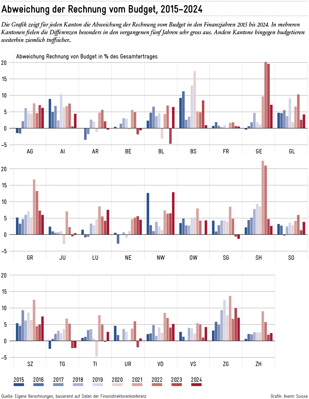 Auch Jura, Bern, Appenzell Ausserrhoden und Uri budgetieren ziemlich treffsicher. Sehr hohe Abweichungen zwischen Budget und Rechnung weisen dagegen die Kantone Schaffhausen, Zug, Basel-Stadt, Graubünden, Schwyz und Genf auf. In Schaffhausen und Genf erreichte die Differenz in zwei Jahren 20% der gesamten Einnahmen. Zug budgetierte in den letzten Jahren als einziger Kanton deutliche Überschüsse, übertraf diese letztlich aber trotzdem noch deutlich.