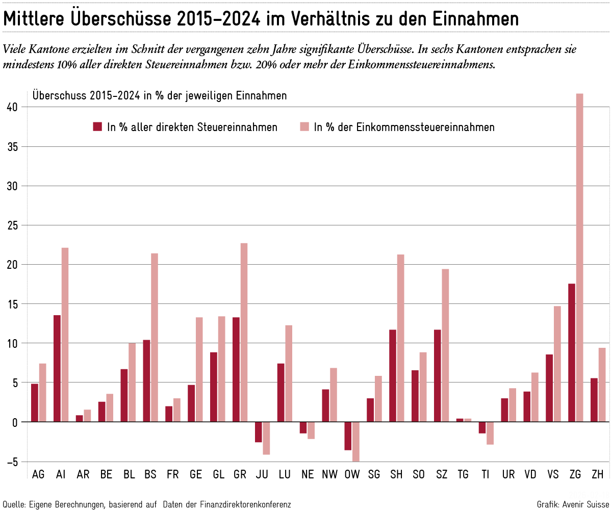 Dabei handelt es sich wohlgemerkt um Durchschnittswerte über die Zehn-Jahres-Periode 2015-2024. In einzelnen Jahren hätten noch deutlich höhere Rabatte resultiert. Der Extremfall ist der Kanton Zug, wo der Überschuss im Jahr 2023 gereicht hätte, um komplett auf die Erhebung von Einkommenssteuern zu verzichten – wer von einer Monacoisierung des Kantons Zug spricht, liegt also zumindest hinsichtlich dieses Aspekts näher an der Wahrheit, als man denken könnte.