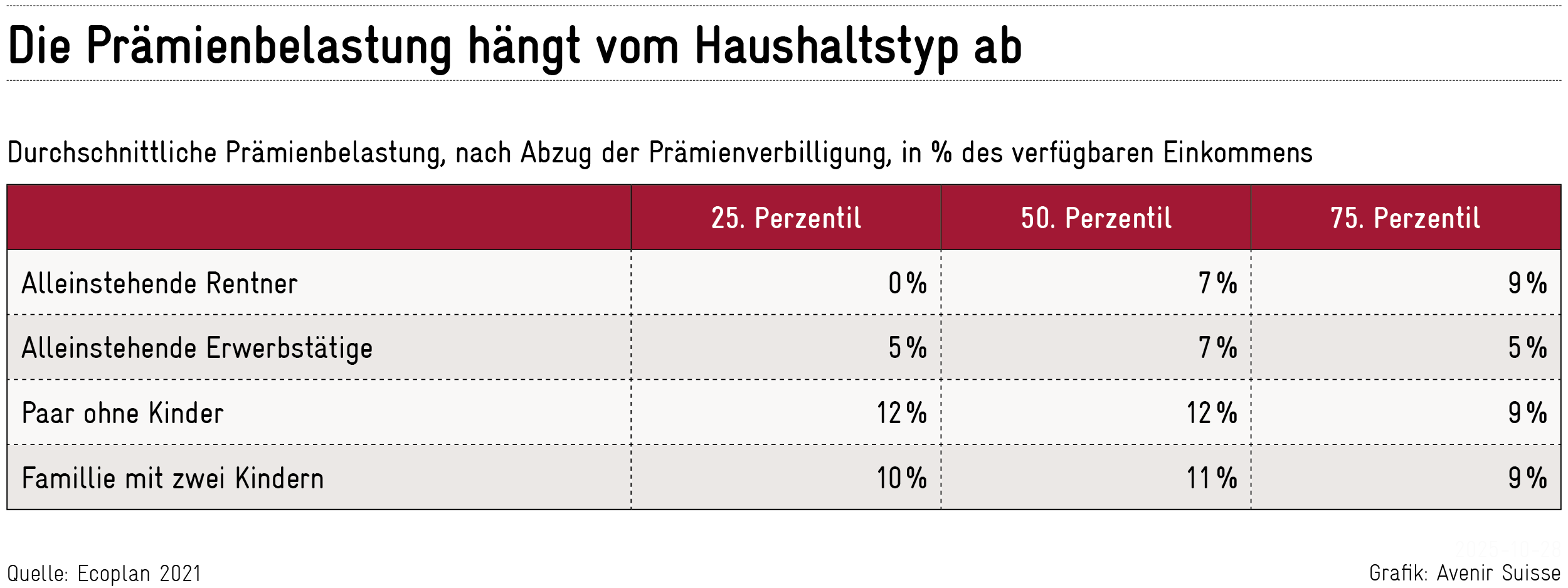 Die folgende Tabelle zeigt, wie stark sich die Prämienlast je nach Einkommen und Haushaltstyp unterscheidet: Sie reicht von 0 bis 12% des verfügbaren Einkommens. Bei alleinstehenden Rentnern steigt die relative Belastung mit dem Einkommen. Für Paare mit Kindern und für alleinstehende Erwerbstätige nimmt sie bis zum Medianeinkommen zu und sinkt danach wieder.
