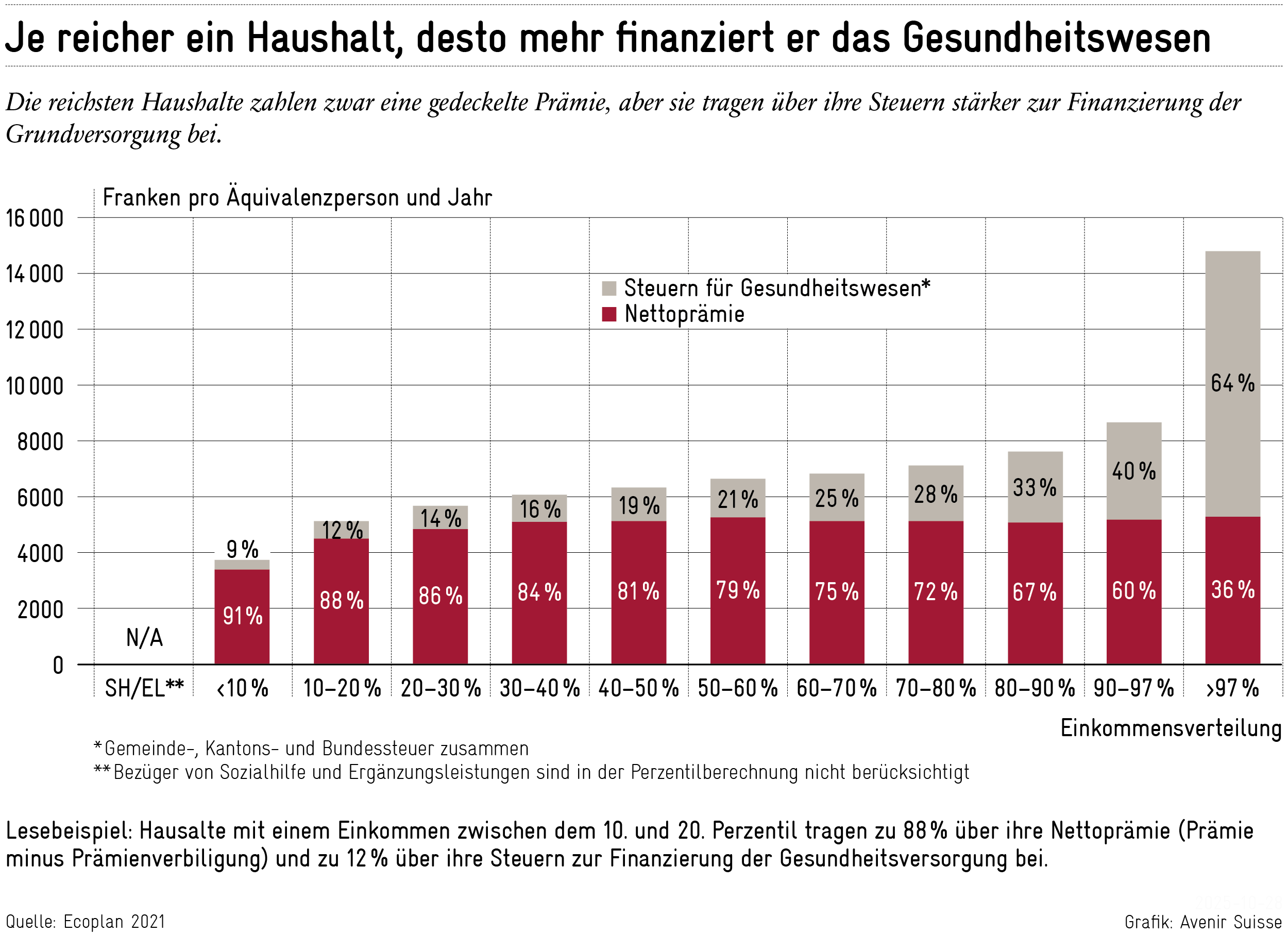 Die Mittelschicht und die wohlhabenderen Haushalte haben ihrerseits zwar eine gedeckelte Prämie, aufgrund der Steuerprogression ist ihr Steueranteil jedoch deutlich höher. So machen die Steuern rund um das Medianeinkommen etwa ein Fünftel, zwischen dem achten und neunten Einkommenszehntel bis zu einem Drittel der Gesundheitsausgaben aus. Die 3% der einkommensstärksten Haushalte zahlen über Steuern sogar doppelt so viel wie über Prämien.