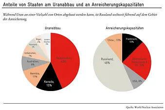 Noch etwas grösser ist die Abhängigkeit bei der Urananreicherung, bei welcher der Anteil des spaltbaren Isotops Uran-235 erhöht wird. Hier kontrolliert Russland fast die Hälfte der Kapazitäten. Dies ist unter anderem darauf zurückzuführen, dass die europäischen Unternehmen ihre Anreicherungskapazitäten durch den Nichtersatz von Zentrifugen kontinuierlich reduziert haben. Es ist daher davon auszugehen, dass ein Teil der weltweiten Nachfrage nicht gedeckt werden könnte, wenn angereichertes Material aus Russland sanktioniert würde. Aufgrund von Puffervorräten wäre die Stromerzeugung in diesem Fall erst mittelfristig betroffen.