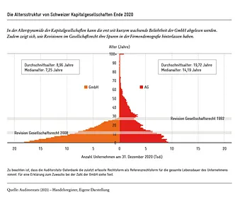 Die Erstellung einer Alterspyramide legt offen, wie sich ausserordentliche Ereignisse in der Firmenlandschaft niederschlagen. Was bei der klassischen Demografie Seuchen, Kriege oder «Pillenknick» sind, sind bei der Firmendemografie Revisionen im Gesellschaftsrecht: Gesetzesänderungen haben in der Alterspyramide der beiden Kapitalgesellschaften AG und GmbH ihre Spuren hinterlassen.[4]