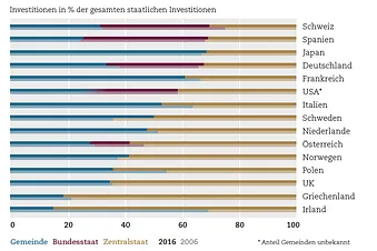 Dass die Schweiz ein stark dezentralisiertes Land ist, zeigt sich auch bei den staatlichen Investitionen: Nur 30% davon entfielen 2016 auf den Bund, die anderen 70% auf die Kantone und die Gemeinden. Noch zehn Jahre zuvor lag allerdings der Bundesanteil sogar bloss bei 25% – es hat also eine Zentralisierung der Investitionen stattgefunden. Trotzdem ist die Schweiz auch diesbezüglich noch stärker dezentralisiert als andere wichtige Länder. Zudem steht sie mit dem Trend zur Zentralisierung nicht alleine: Im ungewichteten Mittel aller dargestellten Länder stieg der Anteil des Zentralstaates an den gesamten staatlichen Investitionen zwischen 2006 und 2016 von 45,4% auf 51%. Am extremsten war diese Entwicklung in Irland, wo diese Quote von 31% auf geradezu 85% explodierte.