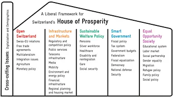 Avenir Suisse wants to contribute to ensuring and increasing the prosperity of broad sections of the Swiss population on a long-term basis. To do so, our research focuses on five drivers which we see as key to the further development of “Prosperity House Switzerland.” Additionally, we look at cross-sectional themes such as digitization and demographics, which influence all the drivers and are therefore incorporated in all our proposed solutions.