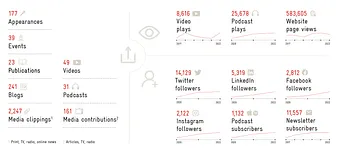 The number of appearances at conferences and panels had already increased again in 2021 after the pandemic-related restrictions. In the 2022 reporting year it continued to increase, up by almost a tenth to 177. Thanks to a growing focus on electronic and digital media, Communications was increasingly able to disseminate Avenir Suisse content on our social media platforms. This is reflected in a significant increase in video views and podcast plays, as well as in rising follower numbers on Twitter, LinkedIn, Facebook, Instagram, and the various podcast channels. We deliberately accepted a small decline in website views as a result of this strategic decision. At the same time, the content of our website was organized more clearly and the design was streamlined, meaning we can expect a rebound in visitor frequency in 2023.