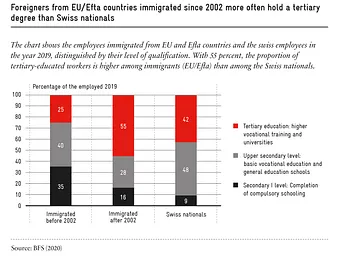 The free movement of people from the EU to Switzerland has prevented educational levels from declining thanks to the arrival of large numbers of skilled workers with tertiary education (higher vocational training and universities) (Seco 2019).