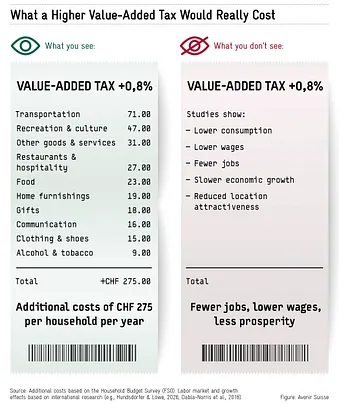 Higher consumption taxes translate into higher prices, eroding household purchasing power. Based on current spending patterns, the increase would cost the average household about CHF 275 per year, according to data from Switzerland’s Household Budget Survey. But that is only part of the story.