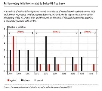 The analysis of parliamentary initiatives — as a reflection of public debate — shows that the votes in favor of an FTA were strongest when Switzerland was under pressure to seek a solution with the United States as a result of the TTIP negotiations. On the other hand, rejections were most common when it came time to talk about the specific contents of an FTA.