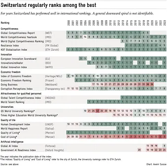 A wealth of global competitiveness and location quality indicators are published every year. Below we have traced 22 of the most important and most discussed rankings back to the year 2000. From innovation and corruption to the general feeling of happiness: How does Switzerland perform in different areas? Are we losing ground over the years?