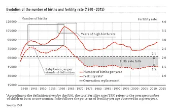 The demographic evolution of society is a gradual process. It is only now that we can feel the impact of certain events that took place one or even two generations ago, as is the case with the “baby boom” following the economic recovery after the Second World War. In the 1940s, Switzerland observed two drastic increases in birth rates, reaching a peak in 1964 (see graph below). Then, along came the contraceptive pill and, with it, a decline in the curve of birth rates, a result known as the “pill effect”; birth rates continued to decline steadily until they stabilized at a weak level in the 1970s. Switzerland’s demographic model, albeit with some differences, is quite similar to most countries of the Western world. The desire to have more children started in the United States just after the end of the war, while other countries, such as Germany, were more concerned with rebuilding their devastated cities. Curiously, the long-term decline in birth rates was less dramatic in France after the “pill effect.”