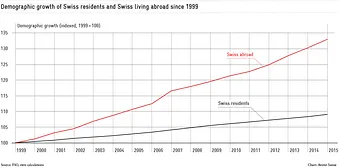Many Swiss citizens chose to live abroad either to study, work or as pensioners. The motives behind this choice are numerous. In recent years, the number of Swiss citizens abroad increased by 2% per year. In 2016, this figure even rose to 2.9%, representing 21,784 individuals, while the number of national voters increased by only 1.1%. A long-term assessment, initiated in 1999, shows that the group representing Swiss living abroad has increased more than twice as faster than the national group (see chart).