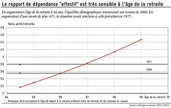 Selon ce rapport de dépendance, la pression sur les actifs ne cesse d’augmenter en Suisse : en 2019, ils étaient 3,2 pour un retraité, près de deux fois moins qu’en 1948 (6,3), lors de l’introduction de l’AVS. Selon les dernières projections de l’Office fédéral de la statistique, ce rapport se réduira à 2,4 actifs par retraités en 2035.