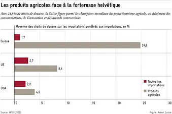 Les droits de douane élevés sur les produits agricoles renchérissent les denrées alimentaires, pèsent particulièrement sur les ménages à faible revenu et bloquent les nouveaux accords de libre-échange, et pas seulement avec les Etats-Unis. Parallèlement, ils ne contribuent pas à la sécurité de l’approvisionnement, mais cimentent des structures coûteuses. Un démantèlement progressif, amorti par la politique sociale, serait judicieux sur le plan économique et crédible sur le plan de la politique extérieure.