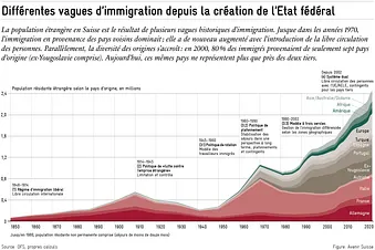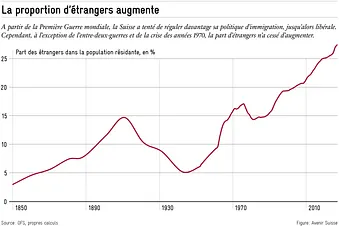 La vague d’immigration en période de haute conjoncture s’amplifiait. Entre 1950 et 1970, la proportion d’étrangers augmentait de 10 points de pourcentage. Pour la première fois, la population résidante étrangère dépassait la barre du million. Parallèlement, les pays d’origine évoluaient : si les premiers immigrants étaient principalement des Italiens, ce sont ensuite des Espagnols et des Portugais, et dans les années 1990, surtout des immigrés originaires de l’ex-Yougoslavie.