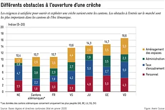 L’indicateur montre que les cantons de Vaud et de Genève accordent peu de liberté à leurs crèches. Le canton de Vaud, par exemple, va jusqu’à prescrire le type de revêtement de sol autorisé dans une crèche, de même que la surface minimale des fenêtres au centimètre près.