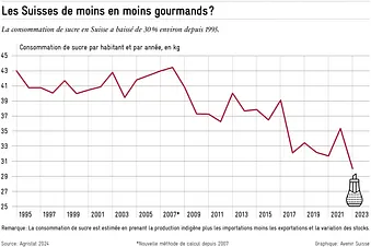 Si le surpoids a augmenté ces 30 dernières années, on n’observe pas pour autant d’explosion de la consommation de sucre. Au contraire, celle-ci a diminué de 30 % entre 1995 et 2023, selon les données d’Agristat utilisée par l’Office fédéral de la sécurité alimentaire et des affaires vétérinaires (OSAV) pour estimer la consommation de sucre en Suisse (voir figure).