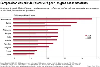 La comparaison internationale montre que l’électricité est chère en Suisse pour les gros consommateurs. C’était déjà le cas il y a dix ans, mais la situation s’est encore aggravée depuis : en 2015, les prix de l’électricité pour les entreprises industrielles en Allemagne, au Royaume-Uni, en Irlande et en Italie étaient plus élevés qu’en Suisse. En 2025, la Suisse occupe désormais la deuxième place derrière le Royaume-Uni et devance les 27 Etats membres de l’UE. Dans aucun autre pays de notre comparaison, les prix de l’électricité industrielle n’ont augmenté autant en pourcentage. En Suisse, ils ont doublé en l’espace de dix ans.