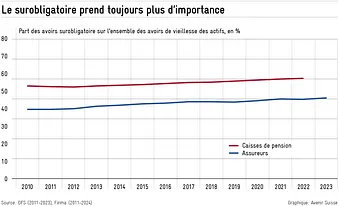 Depuis la révision de 2004, le cadre obligatoire de la LPP est resté inchangé, mais les solutions enveloppantes ont gagné en importance. Aujourd’hui, 91 % des caisses de pension et 82 % des assurés en bénéficient. Dans les caisses de pension (semi-autonomes), la part des avoirs surobligatoires est passée de 57 % à 60 % lors de la dernière décennie (voir graphique). Pour chaque franc de la LPP obligatoire, un franc et demi supplémentaire est épargné dans le surobligatoire. L’évolution des avoirs dans les assurances complètes suit une évolution parallèle, mais à un niveau inférieur.