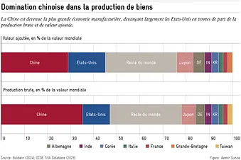 L’essor économique de la Chine repose essentiellement sur sa domination dans la production de biens. La part de la Chine dans la production brute mondiale de l’industrie manufacturière a été multipliée par sept entre 1995 et 2020. Avec une part de 35 %, la Chine domine clairement les chaînes d’approvisionnement mondiales (voir figure ci-dessous).