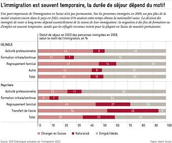 Une analyse des personnes ayant immigré dans la population résidente permanente en 2009 le montre : après deux ans, une personne sur quatre a quitté la Suisse ; après cinq ans, une sur trois. Quinze ans après leur arrivée, un peu plus de la moitié des immigrés vivent encore dans le pays et environ 15 % ont été naturalisés.