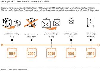 Si la Suisse a également fait un pas dans la bonne direction dès 1997, avec la révision de la loi sur la Poste, elle s’est arrêtée à mi-chemin, comme souvent (voir graphique) : en 1998, le poids maximal des colis dont la Poste possède le monopole d’expédition est abaissé à deux kilos. Puis une deuxième étape amène à supprimer en 2004 toute limite de poids et à libéraliser totalement le marché de l’expédition de colis. Mais ce n’est pas le cas des lettres. Il a fallu attendre jusqu’en 2006 pour que le monopole de la Poste sur l’envoi de lettres soit modifié et abaissé à 100, puis à 50 g, dans le cadre d’une nouvelle révision de la loi sur la Poste en 2009. La suppression du monopole, alors envisagée, est cependant rejetée cette proposition au motif que celui-ci restait nécessaire pour garantir le financement du service universel. Par la révision de 2009, le législateur entendait aussi simultanément créer les conditions-cadre d’une concurrence effective. Ces deux objectifs étaient diamétralement opposés, mais le Parlement occulta largement la contradiction. Il est pourtant évident qu’en concédant un monopole résiduel, une large part du marché des lettres reste inaccessible aux autres prestataires. A ce jour, environ 75% du volume de lettres national adressé est toujours soumis au monopole résiduel.