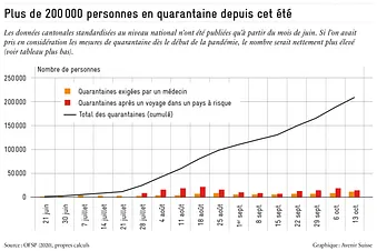 Les données nationales de l’OFSP sont incomplètes, les cantons ne fournissant pas tous toutes les informations nécessaires. Néanmoins, ces données constituent actuellement la meilleure base pour estimer le nombre de personnes en quarantaine en Suisse. Selon nos calculs, plus de 200 000 quarantaines ont été ordonnées en moins de quatre mois (voir graphique).