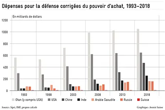 Cela signifie que des pays comme la Chine ont rattrapé leur retard en termes d’innovation, de recherche et de développement (y compris le développement militaire). Par rapport à 1993, Pékin a augmenté ses dépenses de défense corrigées du pouvoir d’achat de 1249% et les Etats-Unis de 118%. L’écart par rapport aux Etats-Unis se réduit de plus en plus (voir graphique 1). Ces chiffres coïncident avec l’analyse du Center of Security Studies de l’ETH Zurich, selon laquelle l’avance de la supériorité technologique militaire occidentale diminue particulièrement par rapport à la Chine. Au lieu de contrecarrer cette tendance à la baisse par une coopération multilatérale accrue, la stratégie «America First» se manifeste sous la forme d’accords bilatéraux et d’une dévaluation progressive des institutions multilatérales. L’incapacité de ces institutions (Otan, OMC, G7, G20) à agir peut, à moyen et long terme, conduire à un monde dit «G-zéro» sans direction claire.