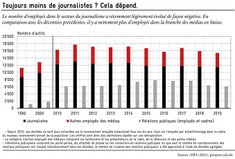 Toutefois, à plus long terme, le soi-disant déclin du journalisme s’inverse lui aussi. Le nombre de journalistes a continuellement augmenté de 1990 à 2010. Il convient de noter qu’à partir de 2010, l’OFS est passé à une enquête par échantillonnage. Néanmoins, l’échantillon de 200’000 personnes devrait être tout à fait représentatif. De plus, la tendance était déjà clairement à la hausse lors des deux enquêtes exhaustives de 1990 et 2000. Sur la base des données agrégées de l’OFS concernant les personnes actives, on ne peut donc pas parler d’une réduction historique dans la branche des médias.