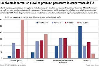 La relation entre le niveau de formation et «l’avantage de l’IA» n’est toutefois pas linéaire. D’une part, on observe aussi des personnes peu qualifiées qui profitent de l’IA. D’autre part, un diplôme formel élevé n’offre pas à lui seul une protection complète contre la concurrence (potentielle) de l’IA qui menace un actif sur quatre titulaires d’un diplôme universitaire et presque un actif sur trois ayant achevé une formation professionnelle supérieure.