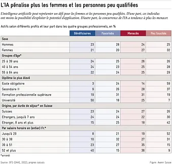 Comme le niveau de formation et le revenu se trouvent en corrélation sur le marché du travail, les personnes qui gagnent déjà plus que la moyenne devraient profiter davantage de l’IA. Avec 52 francs par heure, le revenu médian des personnes actives «bénéficiaires» est nettement supérieur à la moyenne générale de 38 francs par heure. Chez les actifs «peu touchés», dont la majorité n’a qu’un faible niveau de formation, le salaire horaire médian est en revanche d’environ 30 francs.
