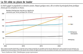 Le remplacement était annoncé. Depuis des années, les nouvelles entreprises en Suisse sont plutôt créées sous forme de Sàrl que de SA. La course à la Sàrl effectuée ces dernières années est impressionnante. Ainsi, début 2006, on comptait à peine 90 000 Sàrl, soit deux fois moins que les sociétés anonymes. Aujourd’hui, la situation s’est inversée et la Sàrl a remplacé la SA comme forme juridique la plus populaire avec plus de 230 000 entreprises.