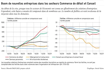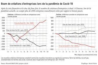 Alors que les données sur les faillites indiquent certaines tendances de gel de l’économie, le boom des nouvelles entreprises dépeint un tableau bien différent. Comme les faillites sont susceptibles d’être faussées par les aides d’Etat, les entreprises nouvellement créées donnent probablement une image plus adéquate du développement économique. Un record a été battu dans les nouvelles inscriptions au registre du commerce en 2020, ce qui suggère que les besoins de la société ont en réalité considérablement changé, et que les nouvelles entreprises répondent à l’évolution de la demande.