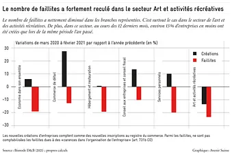 Contrairement à la branche de l’hébergement, qui a connu une légère vague de créations d’entreprises au milieu de l’année, les créations d’entreprises dans le secteur des arts et des activités récréatives ont été constamment inférieures aux chiffres de l’année précédente. Cette différence d’évolution pourrait s’expliquer par les restrictions plus longues imposées aux grands événements.