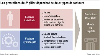 Outre ces facteurs individuels, les prestations dépendent également de facteurs liés au système. La loi sur la prévoyance professionnelle est une loi-cadre qui fixe des exigences minimales de protection sociale. Les caisses de pension peuvent toutefois décider d’aller au-delà de ces exigences, permettant ainsi l’accumulation d’un capital plus important jusqu’au départ à la retraite. Le niveau de capital accumulé dépend également de la performance des placements de la caisse de pension sur les marchés financiers. Enfin, le capital accumulé peut alors être transformé en rente sur la base du taux de conversion propre à chaque caisse de pension, pour autant que les exigences légales minimales de prestations soient respectées.