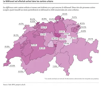 Les actifs qui vivent (et souvent travaillent) dans une ville ou une grande agglomération ont plus souvent tendance à télétravailler que ceux qui vivent à la campagne. Deux tiers des salariés travaillant à domicile vivent dans des zones urbaines. Il existe en outre de grandes disparités régionales, probablement liées à la structure sectorielle des cantons. Dans le paysage des entreprises multinationales des cantons de Zurich, Zoug, Bâle et Genève, il y a par exemple une plus grande proportion d’emplois avec des options de travail à domicile que dans les cantons où l’agriculture ou le tourisme sont des secteurs importants.