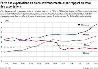 Malgré l’absence d’accord, le commerce de biens environnementaux a atteint un nouveau record en 2022, avec une valeur totale de 1,9 milliards de dollars, selon la Conférence des Nations unies sur le commerce et le développement (CNUCED). Les champions de l’exportation de biens environnementaux sont la Chine et l’Allemagne, dont la part dans les exportations totales augmente depuis longtemps. En Suisse, cette part est en revanche en baisse, ce qui est probablement lié à la forte augmentation des exportations de biens non environnementaux (p. ex. produits pharmaceutiques).