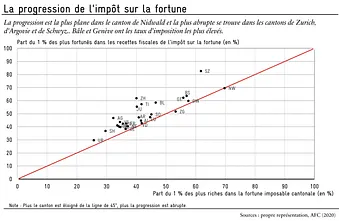 Le poids de cet impôt pèse donc essentiellement sur les plus fortunés. Les barèmes sont progressifs dans tous les cantons, de sorte que le taux d’imposition moyen augmente avec l’accroissement de la richesse (voir représentation dans la figure ci-dessous, qui compare la part du 1 % des plus riches dans la fortune imposable cantonale (axe horizontal) avec les recettes fiscales (axe vertical).