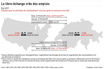 Le potentiel de création d’emplois d’un accord de libre-échange entre la Suisse et les Etats-Unis est important. De nombreux emplois bénéficient déjà des liens économiques entre les deux pays. Selon les calculs, c’est actuellement le cas de plus de 700 000 emplois, dont environ 260 000 en Suisse et 450 000 aux Etats-Unis. Pour la Suisse, l’échange de biens et de services crée beaucoup plus d’emplois (180 000) que les investissements directs des Etats-Unis en Suisse (90 000). Les Etats-Unis sont le deuxième partenaire économique de la Suisse après l’UE, tant en termes d’échanges de biens et de services que d’investissements directs. Pour les Etats-Unis, c’est exactement le contraire : l’échange de biens et de services ne génère «que» 140 000 emplois environ, tandis que les investissements directs suisses créent 320 000 emplois aux Etats-Unis. La Suisse est le dixième partenaire commercial pour les biens et services et le septième investisseur direct aux Etats-Unis.
