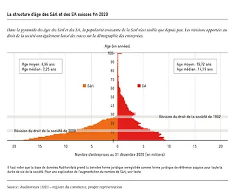 La création d’une pyramide des âges révèle l’effet qu’ont les événements extraordinaires sur le paysage entrepreneurial. Les épidémies, les guerres ou la «chute de natalité» dans la démographie classique sont les équivalents de révisions du droit de la société dans la démographie des entreprises. Par exemple, les modifications législatives ont laissé sur la pyramide des âges des SA et Sàrl.[4]